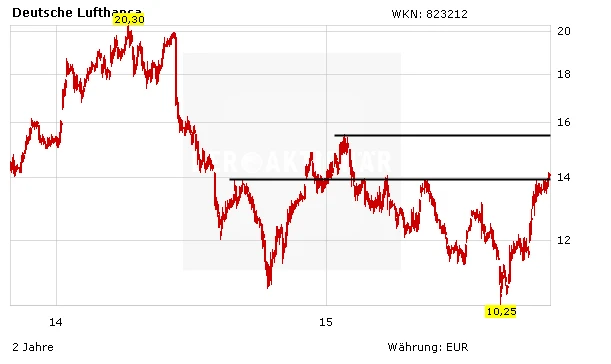 Mit dem jüngsten Anstieg ist der Lufthansa-Aktie der Sprung über die enorm wichtige Hürde bei 14 Euro gelungen. Nun rückt das 52-Wochen-Hoch, das Anfang Februar dieses Jahres bei 15,53 Euro ausgebildet wurde, in den Fokus. DER AKTIONÄR empfiehlt investierten Anlegern, an Bord zu bleiben und bestehende Positionen mit einem Stopp bei 12,00 Euro nach unten abzusichern.