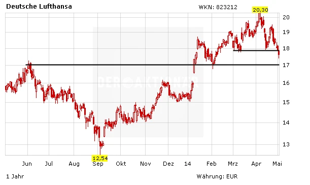 Zum Wochenbeginn kann sich auch die Lufthansa-Aktie dem schwachen Gesamtmarktumfeld nicht entziehen. Mittlerweile ist die horizontale Unterstützung bei 18 Euro gebrochen worden. Die nächste wichtige Chartmarke wartet nun bei 17 Euro. Investierte Anleger bleiben dabei und beachten den Stopp bei 16 Euro.