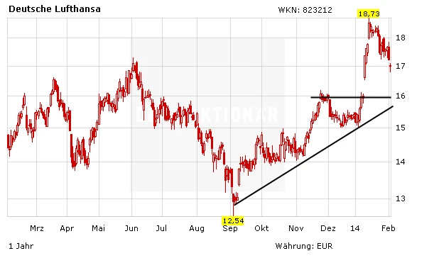 Die Papiere der Deutschen Lufthansa zählen am Dienstag zu den größten Verlierern im DAX. Die Aktie ist unter das letzte Zwischentief bei 17,23 Euro gefallen. Damit droht ein weiterer Kursrutsch bis zum Gap-close Anfang des Jahres bei 16,00 Euro.