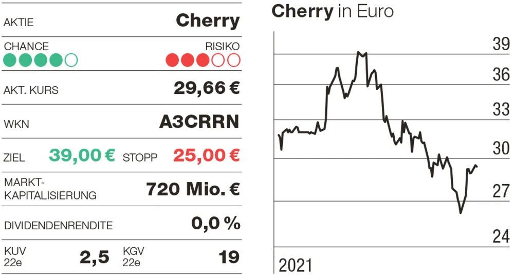 Operativ ist Cherry trotz aller Lieferkettenprobleme – insbesondere in China – auf Kurs: 2021 sollen 170 Millionen Euro Umsatz und eine EBITDA-Marge von rund 30 Prozent zu Buche stehen. Für 2022 wird erneut ein zweistelliges Umsatzwachstum erwartet, das aber vermutlich niedriger ausfallen dürfte als die 30 Prozent im Jahr 2021.