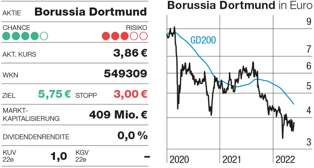 Das gilt auch für die Aktie. Für die vergangenen zwölf Monate steht ein Minus von 38 Prozent zu Buche. Doch die Talsohle scheint durchschritten: Die gefallenen Corona-Sanktionen dürften in der kommenden Saison wieder eine volle Auslastung des Stadions ermöglichen und die Vereinskasse weiter füllen. Durch den Wechsel von Top-Stürmer Erling Haaland zu Manchester City wurden dem Vernehmen nach bereits 75 Millionen Euro an Ablösesumme eingenommen. Teile davon wurden bereits mit der Verpflichtung der Nationalspieler Nico Schlotterbeck und Niklas Süle reinvestiert.