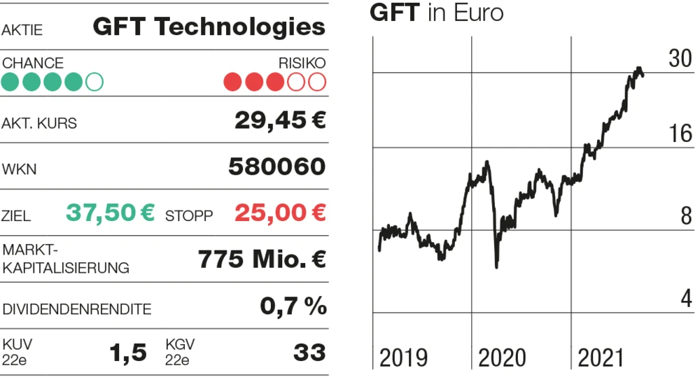 Nachholeffekte und eine gesteigerte Umsetzungsdynamik der Kunden haben GFT Technologies 2021 bisher kräftig in die Karten gespielt. Mit 18 Prozent Umsatzwachstum hat der Spezialist für die digitale Transformation im ersten Halbjahr ordentlich aufgedreht. Das Ende der Fahnenstange ist damit aber noch nicht erreicht. Ende Juli hat der Vorstand daher die Jahresprognose erneut angehoben. Der Umsatz soll im Gesamtjahr sogar um 24 Prozent auf 550 Millionen Euro steigen. Vor Steuern soll der Gewinn um starke 155 Prozent auf 36 Millionen Euro zulegen.