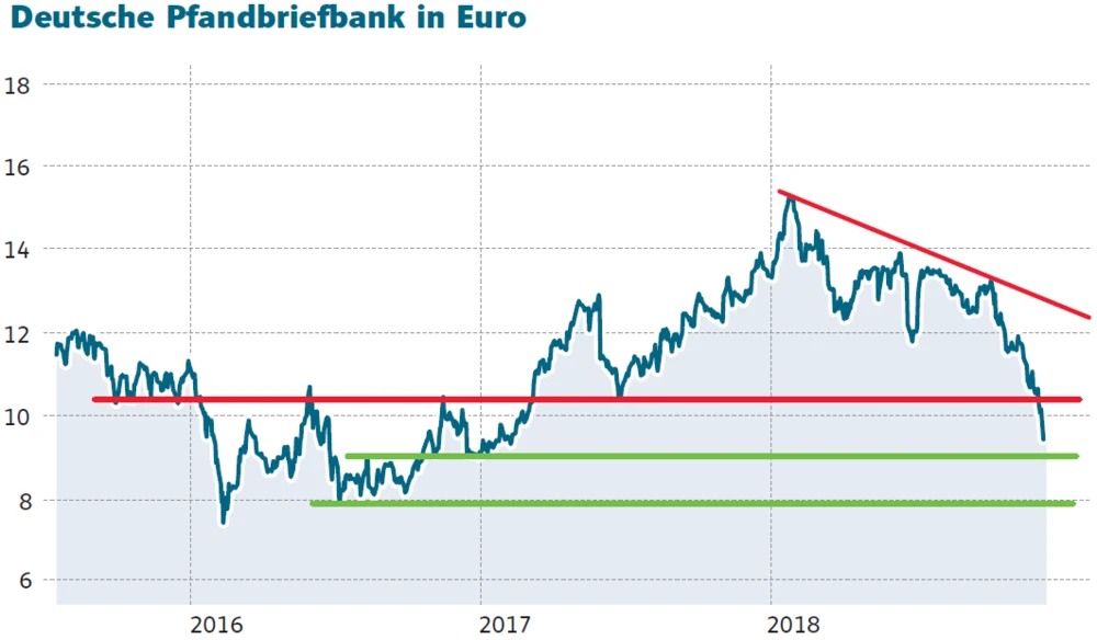Der Kurs der Deutschen Pfandbriefbank findet einfach keinen Boden – im Gegenteil: Am Mittwoch hat sich die Talfahrt noch einmal beschleunigt. Den rund 7-prozentigen Verlust eingerechnet, hat die Aktie seit Anfang Oktober fast 30 Prozent verloren. Vom Allzeithoch bei 15,50 Euro im Januar ist sie inzwischen sogar rund 40 Prozent zurückgekommen.
