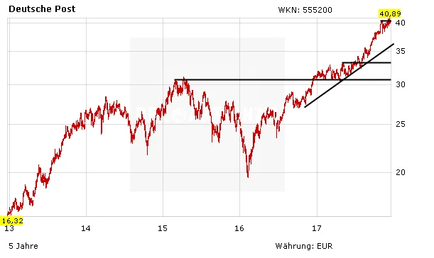 Bei Small Caps kommt es häufiger vor, dass Analysten die Kursziele überarbeiten und sie um satte 30 Prozent erhöhen. Bei DAX-Titeln – vor allem bei wenig volatilen wie der Deutschen Post – ist dies nur ganz selten der Fall. Doch Morgan Stanley sieht für die Aktie nun weitaus größeres Potenzial als bisher – und zwar 50 Euro!