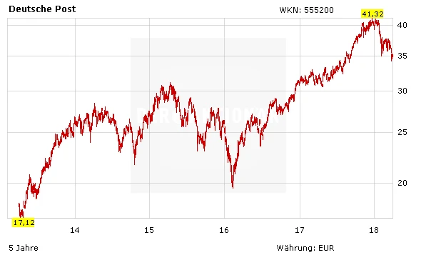 Für das Geschäftsjahr 2017 wird die Deutsche Post 1,15 Euro je Aktie an die Anteilseigner ausschütten. Beim aktuellen Kursniveau errechnet sich daraus eine Rendite von rund 3,3 Prozent.