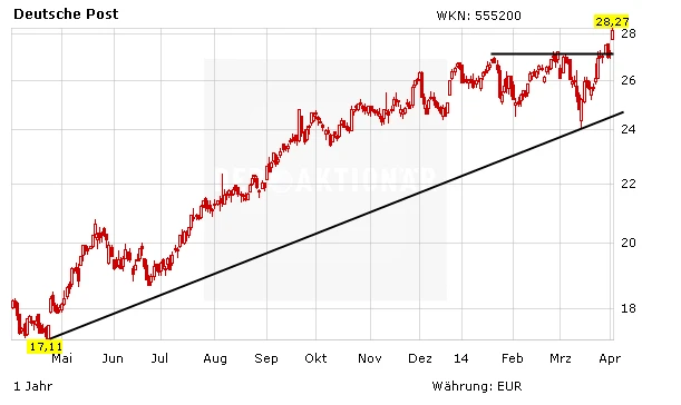 Mit dem Kursschub ist der Ausbruch auf ein neues Allzeithoch geglückt. Die starke Unternehmensprognose dürfte den weiteren Aufwärtstrend stützen. Investierte Anleger bleiben dabei und sichern ihre Position mit einem Stopp bei 23 Euro ab. DER AKTIONÄR sieht den fairen Wert für die Post-Aktie weiter bei 33 Euro.