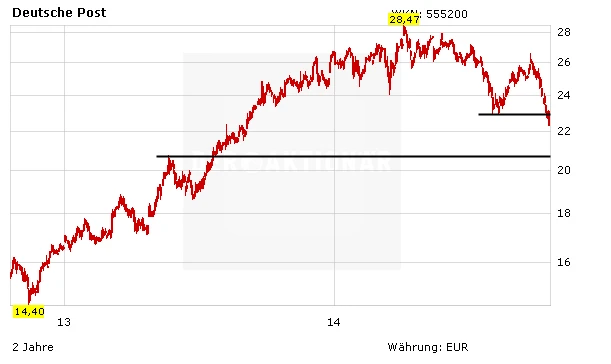 Die Aktie der Deutschen Post ist in den vergangenen Tagen im Zuge der Korrektur am Gesamtmarkt deutlich unter Druck geraten. Auch am heutigen Donnerstag verliert das Papier erneut mehr als zwei Prozent auf 21,82 Euro. Aus charttechnischer Sicht ist die Aktie damit klar angeschlagen: Der Rutsch unter die Unterstützung bei 23 Euro hat ein Verkaufssignal generiert. Allerdings ist der nächste Support nicht weit entfernt. Bei 20,77 Euro wartet das Maihoch 2013.