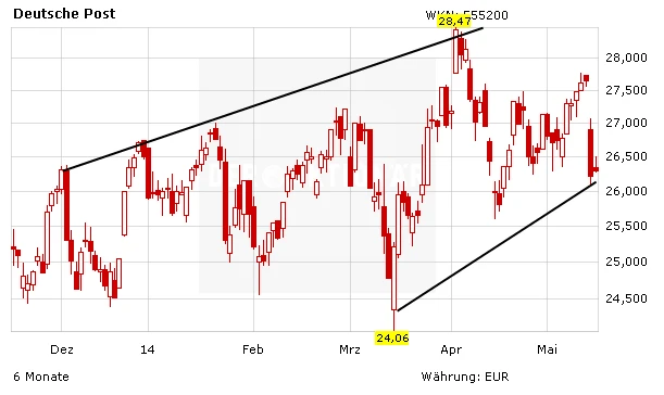 DER AKTIONÄR bleibt für die Entwicklung der Deutschen-Post-Aktie optimistisch. Die Geschäftszahlen zum ersten Quartal dürften zunächst zu weiteren Gewinnmitnahmen sorgen. Der Konzern sollte allerdings mittelfristig weiter vom Aufschwung des Versandhandels im Internet profitieren. Das Kursziel liegt nach wie vor bei 33 Euro. Investierte Anleger sollten ihre Position mit einem Stopp bei 23 Euro absichern.