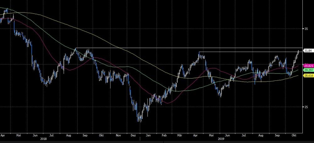 Rein charttechnisch betrachtet bleibt es für die DAX-Titel aber zunächst noch beschwerlich. Denn bereits bei 32,05 und 32,20 Euro liegen weiter Widerstände. Sollten diese Hürden allerdings auch übersprungen werden, wäre anschließend der Weg nach oben frei bis in den Bereich um 36 Euro.