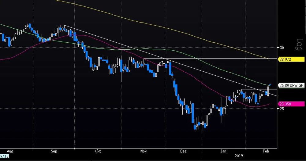 Die kommenden Wochen dürften zeigen, inwieweit die Post diese tiefgreifenden Veränderungen wirklich umsetzen wird. Hingegen ist bei der Aktie vorerst nicht mehr Abwarten angesagt, denn dem DAX-Titel ist nun der Sprung über den Widerstandsbereich bei 26,50 Euro geglückt. Jetzt wäre der Weg nach oben zunächst bis in den Bereich um 29 Euro frei. Anleger können sich nun auf der Long-Seite positionieren. Der Stoppkurs sollte bei 22,80 Euro platziert werden.