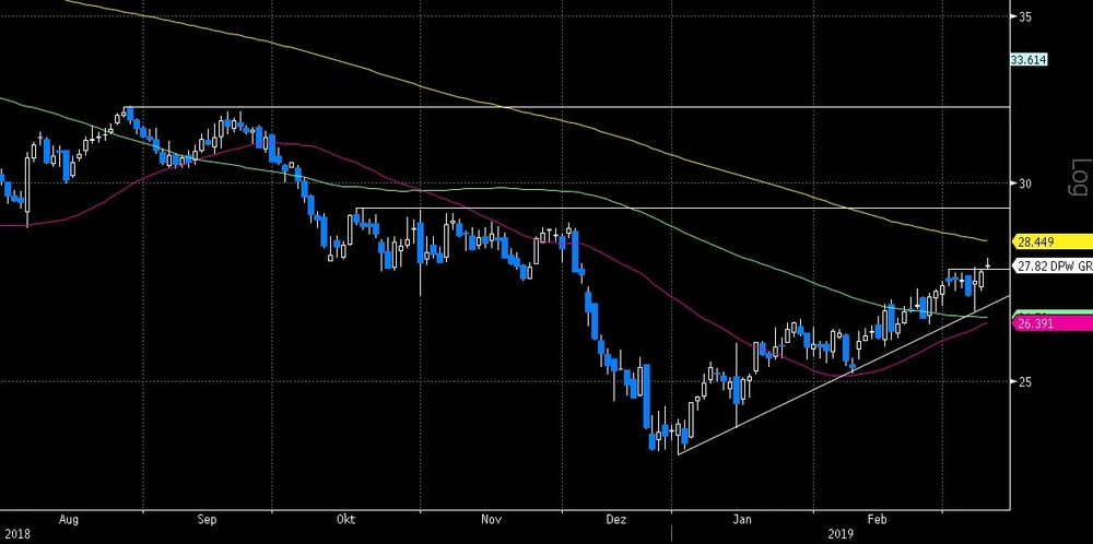 Und auch fundamental betrachtet sehe die Chance für ein gutes Börsenjahr 2019 der Post-Aktie gut. So hat sich der Konzernvorstand zuversichtlich gezeigt, den operativen Gewinn in diesem Jahr wieder deutlich zu steigern (auf 3,9 bis 4,3 Milliarden Euro nach 3,2 Milliarden Euro im Vorjahr). Zudem wurde das ambitionierte Ziel, 2020 ein EBIT von 5,0 Milliarden Euro zu erwirtschaften erneut bekräftigt.