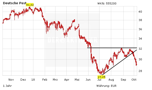 Einen größeren Einfluss des StreetScooters auf das Konzernergebnis der Post sollten Anleger jedoch nicht erwarten. So würde sich der Umsatz im (unrealistischen) Fall des Verkaufs der kompletten Jahresproduktion des Werks in Köln bei einem Verkaufspreis von rund 40.000 Euro auf „nur“ 140 Millionen Euro belaufen, was gerade einmal 0,25 Prozent der gesamten Konzernerlöse entspricht.Rein fundamental betrachtet bleiben die mittel- bis langfristigen Aussichten für die Deutsche Post gut. Doch ähnlich wie bei zahleichen anderen DAX-Titeln stimmt das Chartbild aktuell eher wenig zuversichtlich. Ein Einstieg drängt sich derzeit daher nicht auf. Bereits investierte Anleger beachten den Stopp bei 27,10 Euro.