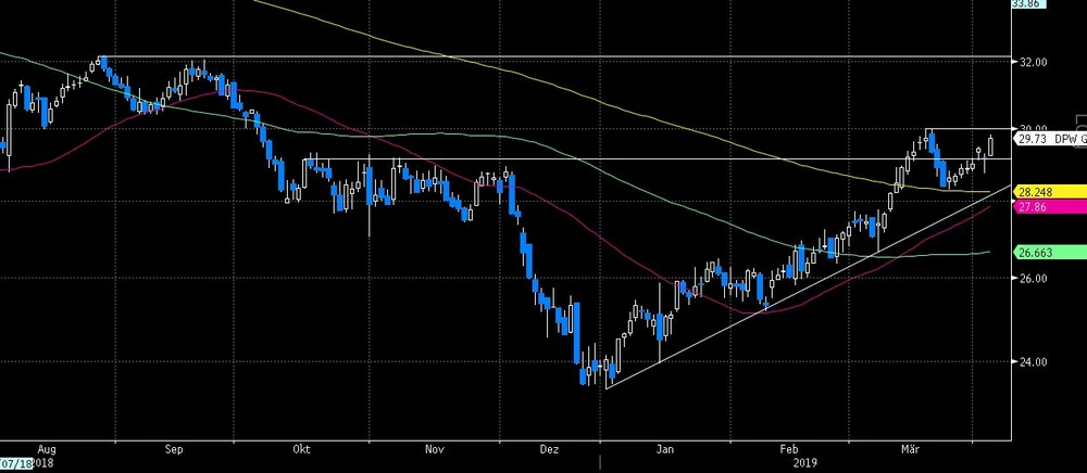 Denn kürzlich war mit dem Erreichen der 30-Euro-Marke zunächst Schluss mit der Rallye der Logistikpapiere. Heute hat sich der DAX-Titel wieder diesem Widerstand angenähert. Zwar ist gut möglich, dass die Aktie morgen eine kleinere Verschnaufpause im Zuge von Gewinnmitnahmen einlegen könnte, dennoch stehen die Chancen gut, dass bald auch die 30-Euro-Marke zurückerobert wird. Sollte es gelingen, diese Hürde zu nehmen, so liegt bei 32 Euro bereits der nächste Widerstandsbereich.