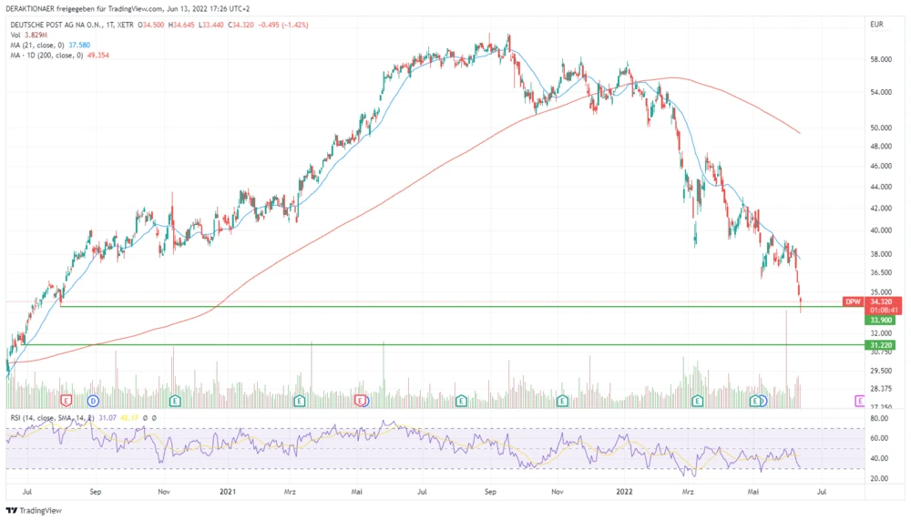Trotz der positiven Studie und Einstufung von JPMorgan sehen die Anleger heute nicht nur bei der Deutsche-Post-Aktie schwarz. Interessierte sollten nicht in das fallende Messer greifen und zunächst auf eine Stabilisierung warten. Investierte Anleger beachten den Stopp bei 29,00 Euro.