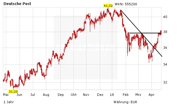 DER AKTIONÄR bleibt für die Aktie der Deutschen Post nach wie vor zuversichtlich gestimmt. Der Logistikriese dürfte auch in den kommenden Jahren Umsätze, Gewinne und Dividenden weiterhin steigern. Die DAX-Titel bleiben daher eine gute Depotbeimischung. Der Stopp sollte bei 31,50 Euro belassen werden.