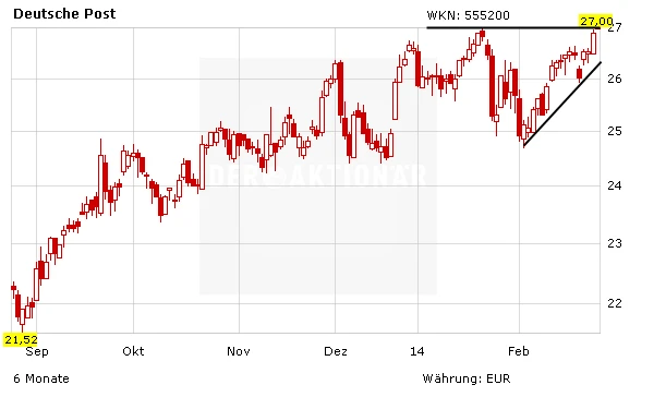 Nach einer kurzen Schwächephase macht die Aktie der Deutschen Post aus charttechnischer Sicht wieder einen guten Eindruck. Gelingt der Ausbruch über das alte Bewegungshoch bei 27,00 Euro, dürfte sich der Aufwärtstrend fortsetzen. Unterstützung gibt es von Seiten der Analysten. Sowohl Deutsche Bank als auch Credit Suisse sehen die Aktie erst jenseits der 30-Euro-Marke fair bewertet.