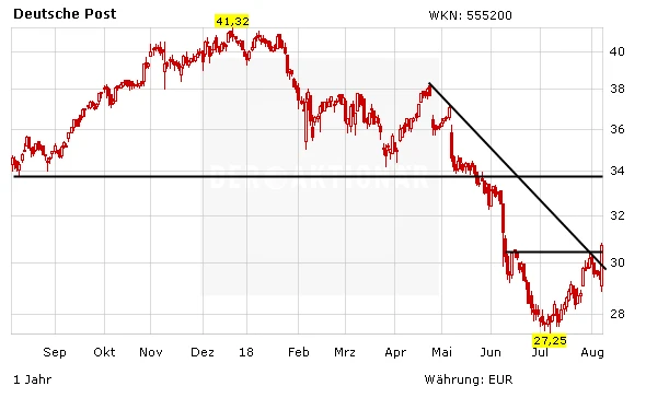 Nach einer steilen Talfahrt hat sich die Post-Aktie mittlerweile wieder gefangen. Mutige Anleger können weiter auf eine Gegenbewegung setzen. Der Stoppkurs sollte hierfür bei 27,10 Euro belassen werden.