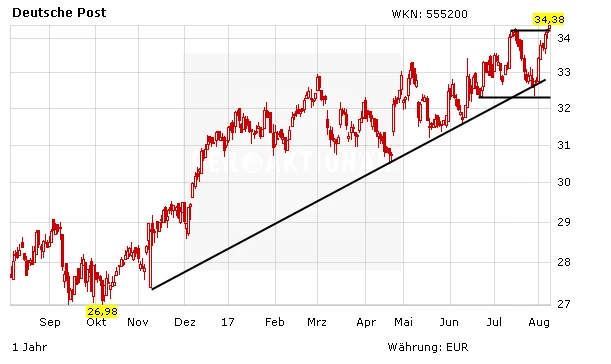 Die Aktie hat heute im vorbörslichen Handel bereits an neuen Rekordmarken geschnuppert. Da es operativ beim Logistikriesen weiterhin rund läuft, stehen die Chancen für weitere Rekordstände gut. Die Aktie ist mit einem 2018er-KGV von 14 und einer Dividendenrendite von 3,5 Prozent immer noch günstiger bewertet als andere Branchenvertreter wie etwa UPS oder Kühne & Nagel. Zudem bleibt das Chartbild stark. Anleger können daher weiter zugreifen (Stopp: 26,00 Euro).