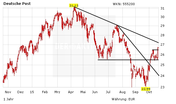Auch DER AKTIONÄR bleibt für die Aktie der Deutschen Post zuversichtlich gestimmt. Durch den Sprung über die Marke von 26,55 Euro wäre der Weg nach oben nun vorerst fei. Und aus fundamentaler Sicht bleiben die im Branchenvergleich günstig bewerteten DAX-Titel ohnehin ein klarer Kauf (Stopp: 21,00 Euro).