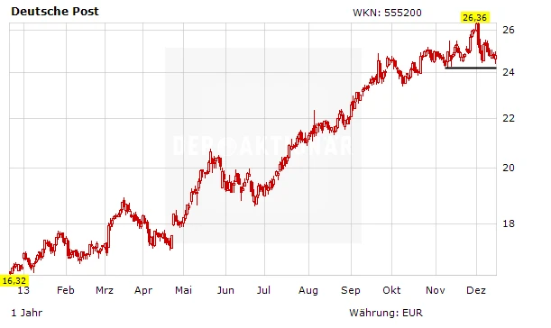 Die US-Investmentbank Goldman Sachs hat sich die Aktie der Deutschen Post vorgenommen. Goldman-Analyst Charles Wilson passte in seiner aktuellen Studie seine Ergebnisprognosen für den Logistikkonzern an das jüngste Zahlenwerk zum dritten Quartal an. Zugleich hat er das Kursziel für die Aktie der Deutschen Post von 28,50 auf 29,00 Euro angehoben. Das ist nun 17 Prozent mehr als der aktuelle Kurs. Wilson stuft die Aktie vor diesem Hintergrund weiter auf "Buy" ein.