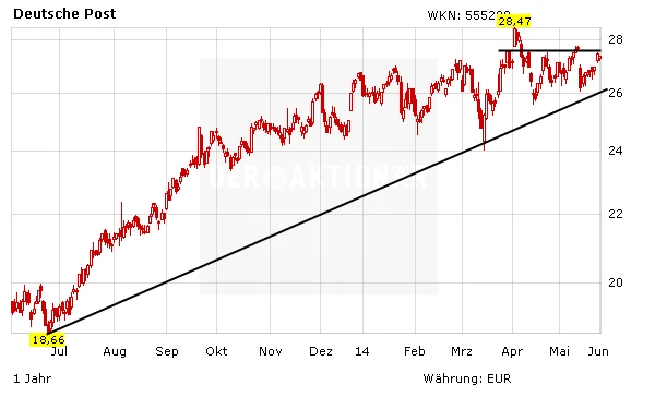 Die Papiere der Deutschen Post verlaufen seit Monaten in einem Seitwärtstrend. Gelingt der Ausbruch über die 27-Euro-Marke wird ein neues Kaufsignal generiert. Auf der Hauptversammlung in der vergangenen Woche stimmte Post-Chef Frank Appel die Aktionäre auf höhere Gewinn und mehr Wachstum ein. Nun hat sich das Analysehaus Independent Research zu Wort gemeldet.
