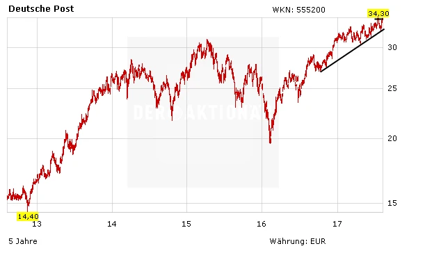 Die mit einem 2018er-KGV von 14 und einer Dividendenrendite von 3,5 Prozent im Branchenvergleich immer noch günstig bewertete Aktie der Deutschen Post bleibt nach wie vor ein klarer Kauf, zumal auch das Chartbild bullish bleibt. Anleger können weiter zugreifen und ihr Investment mit einem Stopp bei 26,00 Euro absichern.