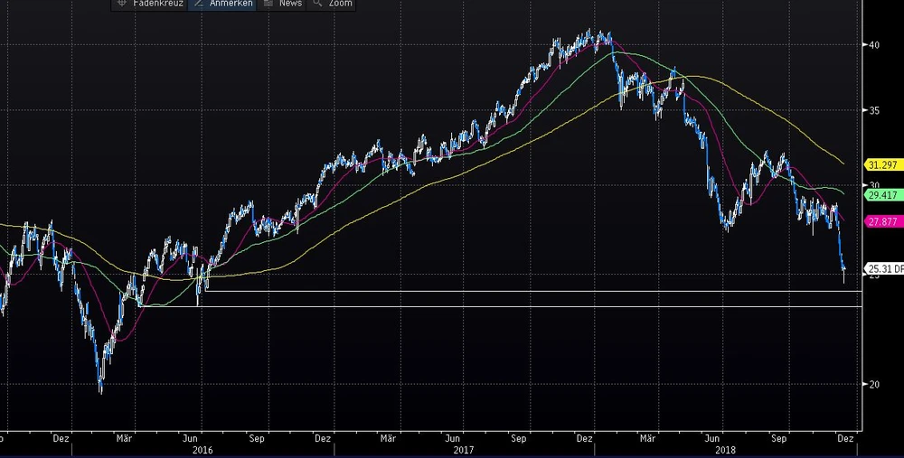 Die erste Marke würde nun bei 24,18 Euro liegen. Gelingt auch auf diesem Niveau die Trendwende nicht, würde wohl der Support bei 23,40 Euro ins Visier genommen werden. Sollte auch diese Unterstüzung nicht halten, dann wäre sogar – rein charttechnisch betrachtet – eine Fortsetzung des Sinkflugs bis auf das Mehrjahres-Tief bei 19,55 Euro möglich. Auf diesem Niveau wären die Anteile des stets profitablen und auch wachsenden Blue Chips allerdings mit einem KGV von lediglich 7 bewertet, so günstig wie nach dem Crash im Zuge der Lehman-Pleite 2008 nicht mehr.