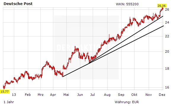 Die Analysten lassen sich von der Drohnen-Diskussion nicht verunsichern. Die Schweizer Bank Credit Suisse stuft die Aktie der Deutschen Post weiter auf „Outperform“ mit einem Kursziel von 28,25 Euro ein. Analyst Neil Glynn hat vor allem das steigende Briefporto im Fokus. Damit könne der Logistikkonzern im kommenden Jahr sein diesjähriges Brief-Ergebnis trotz sinkender Mengen behaupten. Trotz der Kursgewinne sei der DAX-Titel weiter attraktiv.