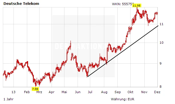 DER AKTIONÄR bleibt bei seiner positiven Einschätzung. Nachdem die T-Aktie nicht nachhaltig unter die Unterstützung bei 11,39 Euro gefallen ist, nimmt sie nun wieder Kurs auf den horizontalen Widerstand bei 11,83 Euro. Wird dieser nachhaltig überwunden, dürfte die DAX-Aktie schnelle neue Jahreshöchststände markieren – und somit die Rallye aus dem Herbst fortsetzen. Risikobewusste Anleger können diese Trading-Chance nutzen und eine erste Position aufbauen. Als Stopp bietet sich die 11-Euro-Marke an.