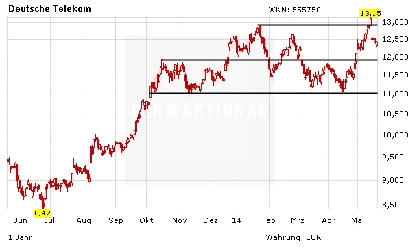 Die Spekulationen über den Verkauf von T-Mobile US sorgten bei der Aktei der Deutsche Telekom zuletzt sogar für Ausbruch über die 13-Euro-Marke. Mit dem Dividendenabschlag von 0,50 Euro je Aktie in der vergangenen Woche ist der Kurs zwar wieder unter die Hürde gerutscht. An dem Szenario hat sich jedoch nichts geändert. Das Kursziel auf Jahressicht lautet nach wie vor 16,00 Euro.