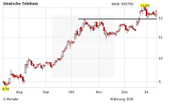 Wird die Marke aus dem Dezember gebrochen, ist der Weg frei bis 13,47 Euro. Mittelfristig ist bei einem Ausbruch Luft bis 15,80 Euro, wo der Hochpunkt aus dem Januar 2008 liegt.