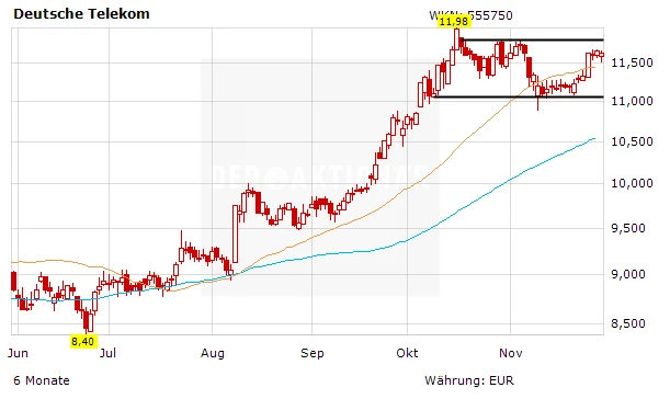 Zur Erinnerung: Die Aktie der Deutschen Telekom hat in den letzten Wochen eine steile Rallye auf das Parkett gelegt. Im Hoch kletterte die T-Aktie Mitte Oktober bis auf 11,98 Euro. Seit diesem Hoch kommt es allerdings zu Gewinnmitnahmen.