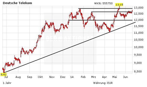 Der Aktienkurs der Deutschen Telekom dürfte auch in der nächsten Zeit vor allem durch die Übernahmefantasien geprägt sein. Das Augenmerk richtet sich nun auf die Wettbewerbshüter, die einen Zusammenschluss noch verhindern könnten. Die Aktie dürfte vorerst weiter von dem Angebot von Sprint profitieren. DER AKTIONÄR sieht das Kursziel bei 16,00 Euro. Ein Stopp bei 10,50 Euro sichert investierte Anleger ab.