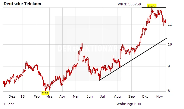 Trotz des jüngsten Rücksetzers der Telekom-Aktie bleibt der Aufwärtstrend weiter intakt. Investierte Anleger bleiben dabei. Gelingt der Ausbruch über das alte Jahreshoch bei 11,93 Euro, dürfte die Aufwärtsdynamik wieder zunehmen.