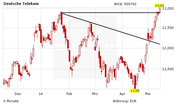 Charttechnisch betrachtet ist der Telekom-Aktie der Ausbruch über das Jahreshoch bei 12,93 Euro gelungen. Damit hat der Wert ein massives Kaufsignal generiert. Sollte der Ausbruch nachhaltig sein, ist der Weg bis in den Bereich von 16,00 Euro frei. Eine Unterstützung findet sich bei 11,10 Euro.