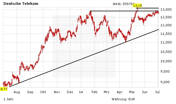 Charttechnisch zählt die Telekom-Aktie weiterhin zu den aussichtsreichsten Aktien im DAX. Gelingt der Ausbruch über das alte Jahreshoch bei 13,15 Euro, setzt sich der Aufwärtstrend fort. Der nächste Widerstand wartet erst im Bereich der 14-Euro-Marke. Das Kursziel des AKTIONÄR lautet nach wie vor 16,00 Euro. Investierte Anleger sichern die Position mit einem Stopp bei 10,50 Euro ab.