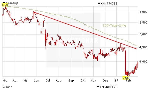 Die britische BT Group, an der die Deutsche Telekom mit zwölf Prozent beteiligt ist, hat wegen eines Bilanzskandals seiner italienischen Tochter einen herben Gewinneinbruch erlitten. Aufgrund von Abschreibungen und Rückstellungen verringerten sich die Profite im Vergleich zum Vorjahr auf weniger als die Hälfte. Die Folge: Ein Kursrutsch von 20 Prozent. In Verbindung mit der Schwäche des britischen Pfundes erwarten Analysten daher eine Wertberichtigung für die Beteiligung von rund drei Milliarden Dollar.