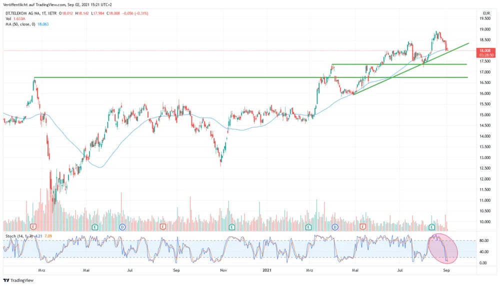 Zunächst sah es bei der Aktie der Deutschen Telekom gut aus. Die Zahlen der Tochter T-Mobile US hatten den Wert beflügelt. In diesem Zuge hat er Anfang August einen starken Rebound an der Unterstützung am markanten März-Hoch bei 17,36 Euro hingelegt. Innerhalb von gut zwei Wochen stürmte der Titel dann auf ein neues Mehrjahreshoch bei 18,91 Euro. Nach diesem Sprint war der Wert jedoch deutlich überhitzt (DER AKTIONÄR warnte). Infolge des stark überkauften Stochastik-Indikators und des negativen Newsflows korrigierte sie bis heute um rund fünf Prozent.