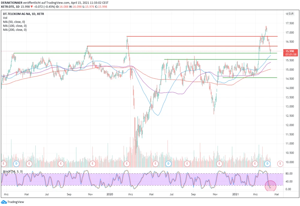 Vergangene Woche spitzte sich die Lage bei der Telekom-Aktie zu. Nach der Auszahlung der Dividende fiel der Wert unter die enorm wichtige Unterstützungslinie, die vom Vor-Corona-Hoch bei 16,75 Euro ausgeht. Am Montag unterschritt der Kurs auch noch die Unterstützung am 2019er-Hoch bei 16,26 Euro (DER AKTIONÄR warnte) und verstärke damit das Verkaufssignal.