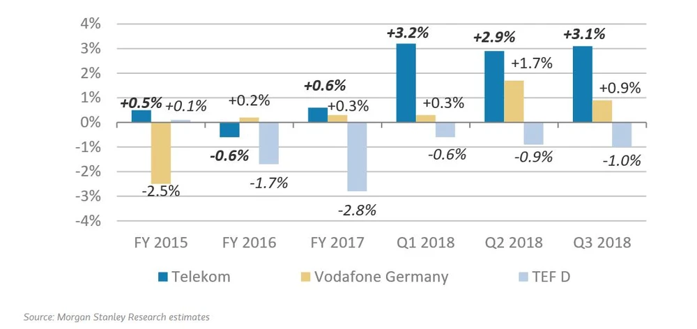 Die Frage ist nicht, ob die Bonner die Investitionen stemmen können - das können sie - sondern, inwiefern sie das zukünftige Wachstum beeinflussen. Zuletzt hatte die Telekom besonders im Mobilfunk stark abgeschnitten und die Konkurrenten beim Umsatzwachstum hinter sich gelassen (siehe Grafik).