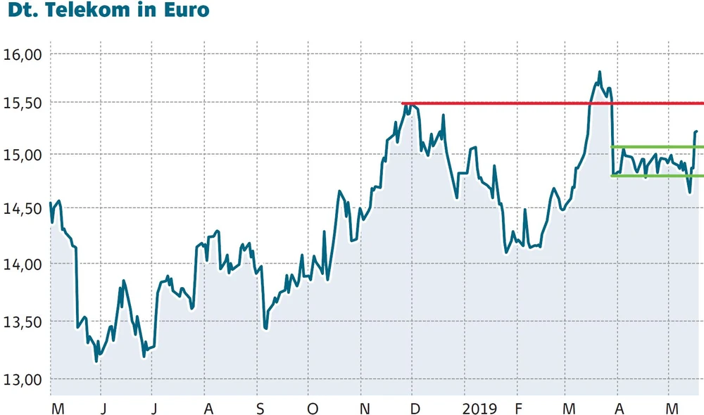 An der Börse ist die Telekom als defensiver Wert derzeit wieder „in“. Nachdem die Aktie seit dem Dividendenabschlag Ende März in einer engen Range zwischen 14,55 und 15,10 Euro pendelte, ist nun der Ausbruch nach oben gelungen. Damit ist nun der Weg frei, um das Gap bei 15,53 Euro zu schließen. Dann rückt auch das 52-Wochen-Hoch bei 15,88 Euro wieder in den Fokus. Gelingt der Sprung über diese Hürde, wäre der weitere Weg nach oben vorerst frei.
