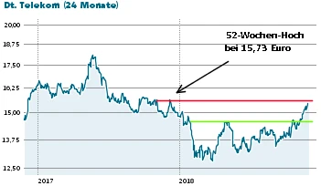 Mit der Kaufempfehlung für die T-Aktie hat DER AKTIONÄR bislang den richtigen Riecher bewiesen und jetzt könnte es sogar noch besser werden, denn: Aktuell nimmt das DAX-Papier sein 52-Wochen-Hoch vom Dezember 2017 ins Visier. Die Chancen für einen Break stehen gut, zumal der positive Newsflow bei den Bonnern anhält.