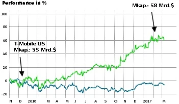 Niemand weiß, was Telekom-Boss mit der wachstumsstarken US-Tochter vor hat. Mit 71,5 Mio. Kunden ist der Mobilfunker mittlerweile auf Rang 3 in den USA, nach AT&T und Verizon aber noch vor Sprint. Seit 2012 ist T-Mobile US mit einer CAGR von 13 Prozent gewachsen und damit so schnell, wie kein anderer Branchenplayer. Für 2016 wiesen die Amerikaner Erlöse von 37 Milliarden Dollar aus und einen Nettogewinn von 1,46 Milliarden Dollar.