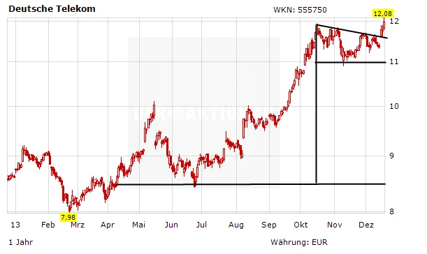 Die Charttechnik gibt ebenfalls grünes Licht. Nach dem Ausbruch aus der Konsolidierungsformation knackte der DAX-Titel am Mittwoch die 12-Euro-Marke. Am Donnerstag steigt der Kurs im frühen Geschäft weiter bis auf 12,14 Euro (Tradegate).