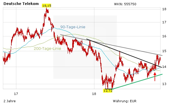 Ein Abwärtstrend seit Dezember 2017 (schwarze Linie) konnte bereits überwunden werden, ein weiterer, ein etwas flacher verlaufender wartet bei 14,74 Euro. Zudem hat die 90-Tage-Linie den 200er-Durchschnitt von unten nach oben geschnitten (roter Pfeil) - ein Signal für weiter steigende Kurse.