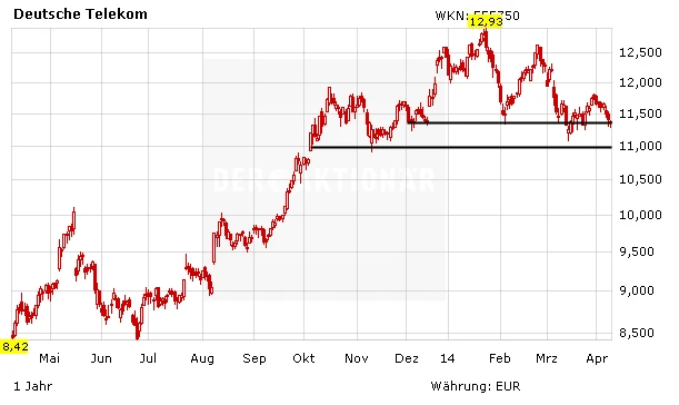 Zuletzt ist die Telekom-Aktie unter die Unterstützung bei 11,40 Euro gefallen. Die nächste wichtige Auffanglinie befindet sich jetzt bei 11,00 Euro. Diese Marke sollte halten.