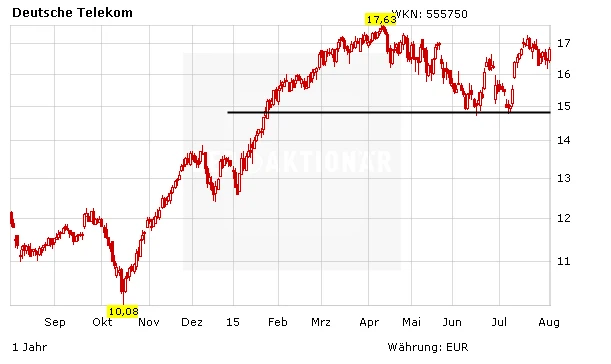 T-Mobile US, an der die Telekom derzeit noch zwei Drittel der Anteile hält, hat in der letzten Woche mit guten Zahlen für das zweite Quartal vorgelegt – am kommenden Donnerstag kann der deutsche Mutterkonzern nachziehen. Die von der Nachrichtenagentur Bloomberg befragten Analysten rechnen im Schnitt mit einem Umsatzplus von 12,6 Prozent auf 17 Milliarden Euro. Beim Gewinn pro Aktie erwarten die Experten einen Anstieg um gut sechs Prozent auf 19 Cent je Anteilsschein.