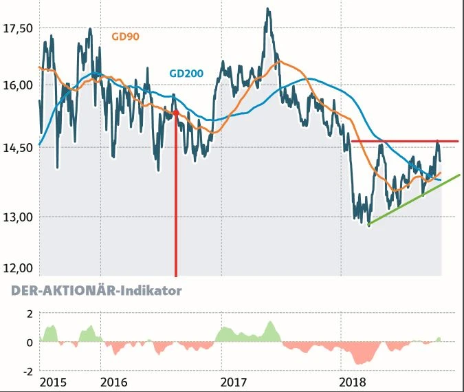 Sofern der DAX-Konzern abliefert und dabei (vielleicht) sogar den ein oder anderen positiven Impuls setzt, dürfte die Aktie die aktuelle technische Dreiecksformation mit dem Sprung über die obere horizontale Widerstandslinie bei 15 Euro beenden. In einem solchen Szenario beträgt das anschließende Kursziel 16 Euro.