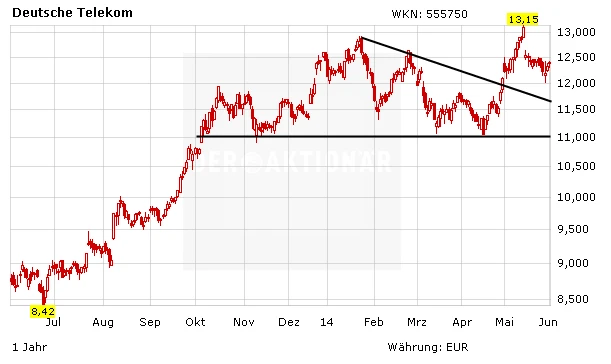 Die Fantasie über den Verkauf von T-Mobile US dürften auch weiter als Kurstreiber dienen. Die Einwände gegen die Übernahme von Sprint sollten geringer ausfallen als im Jahr 2011 beim Versuch von AT&T. Sprint gilt nach AT&T und Verizon als drittgrößter Mobilfunkkonzern in den USA und benötigt die Telekom-Tochter um den Anschluss an die Marktführer nicht zu verlieren. Anleger bleiben dabei und lassen ihre Gewinne laufen. Das langfristige Kursziel lautet 16,00 Euro. Ein Stopp bei 10,50 Euro sichert ab.