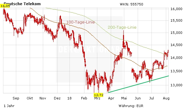 Auslöser für die kurzfristige Rallye der T-Aktie war das Analysten-Upgrade der Citigroup. Die US-Bank hat die Deutsche Telekom von „Neutral“ auf „Buy“ hochgestuft und das Kursziel von 14,50 auf 16,50 Euro erhöht. Der Mittelzufluss des Konzerns sei begrenzt und der Investitionsbedarf halte an, aber der regulatorische Hintergrund wirke unterstützend für die Aktie, schrieb der zuständige Analyst. Das deutsche Heimatgeschäft sei vergleichsweise attraktiv, weshalb er seine Schätzungen dafür erhöht habe.